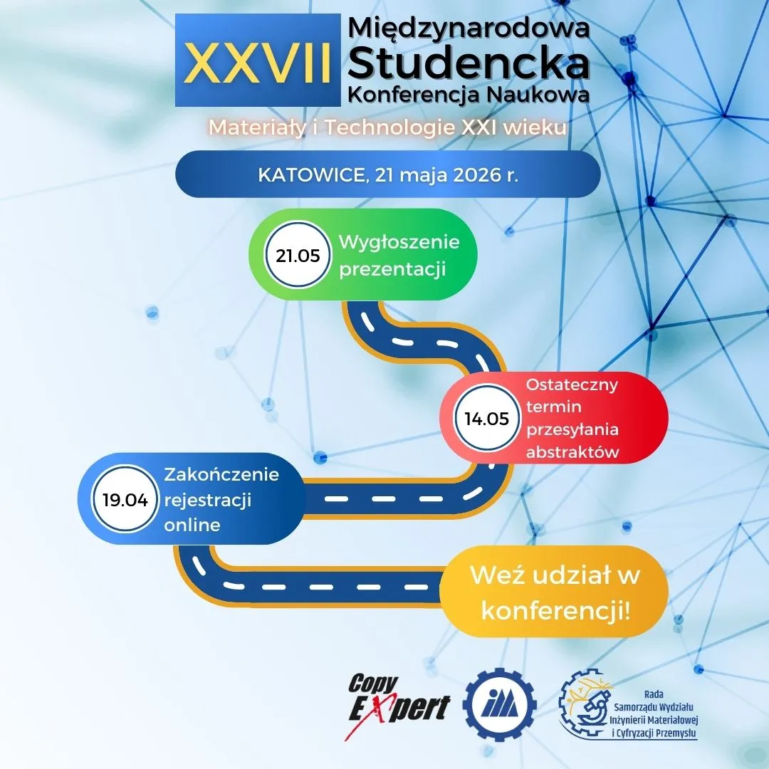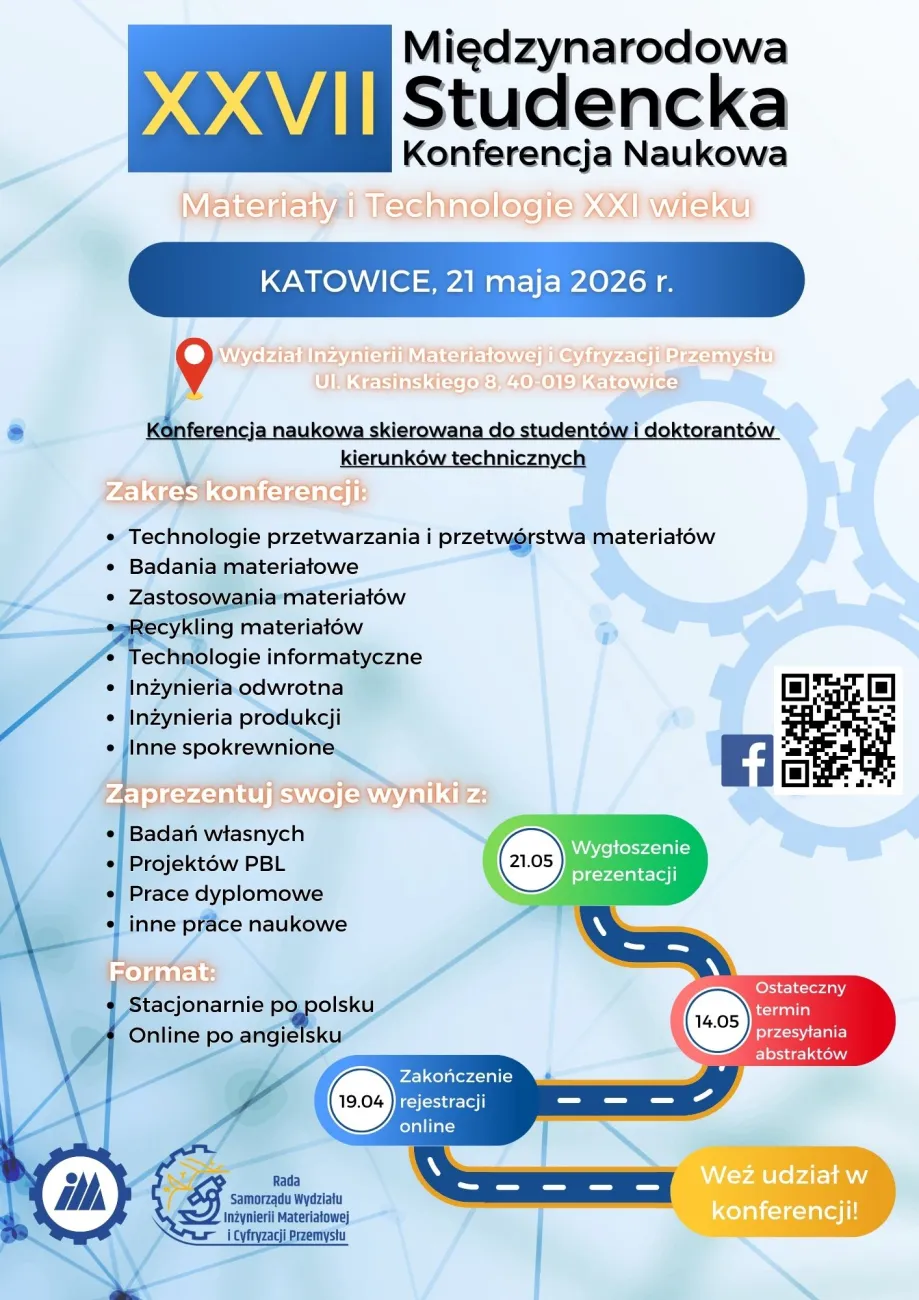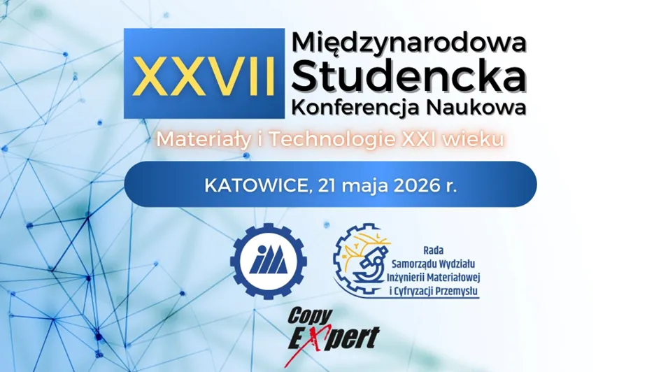 Dziekan Wydziału Inżynierii Materiałowej i Cyfryzacji Przemysłu Politechniki Śląskiej, wraz z Samorządem Studenckim i Kołami Naukowymi Wydziału, serdecznie zapraszają do udziału w 27. Międzynarodowej Studenckiej Konferencji Naukowej „Materiały i Technologie XXI wieku”, która odbędzie się 21 maja 2026 r. w Katowicach.